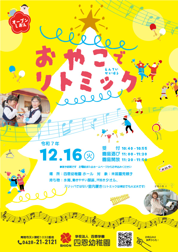 ✨おやこでリトミック✨ 園庭開放のご案内!(^^)!毎年恒例!今年度2回目の開催!!おやこでリトミックに来てみませんか?(*^▽^*)令和7年度第8回園庭開放は、四恩幼稚園のリトミック講師である、渡辺先生による「おやこで … 続きを読む 園庭開放