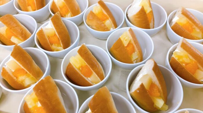 おやつはフルーツサンドでみかん、パイン、白桃を細かく切ってのせています(*^^*)