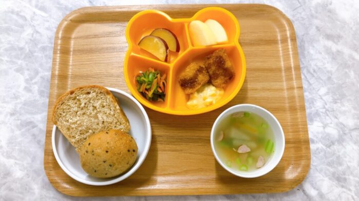 今日は自家製パンの日でなかよしひろばのたまごパンと黒ごまパンが登場しました♪♪