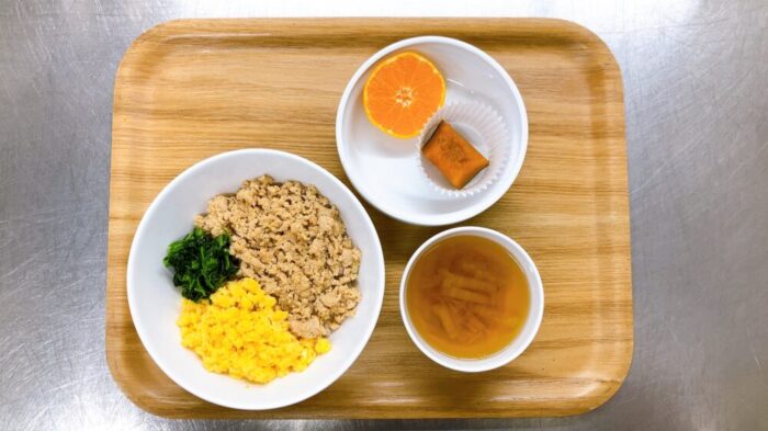 今日は鶏そぼろと玉子とほうれん草の三色丼が登場しましたヽ(^o^)丿