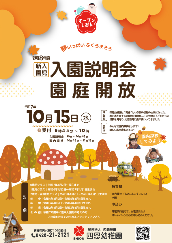 令和7年度 新入園児体験保育は下記の日時で行います。四恩幼稚園の担任の先生が楽しい保育をしますので、是非ご参加ください。 第1回目 体験保育/入園説明会 開催日 令和7年8月30日(土) 10:00~12:00 受付 9 … 続きを読む 体験保育・園見学・入園説明会